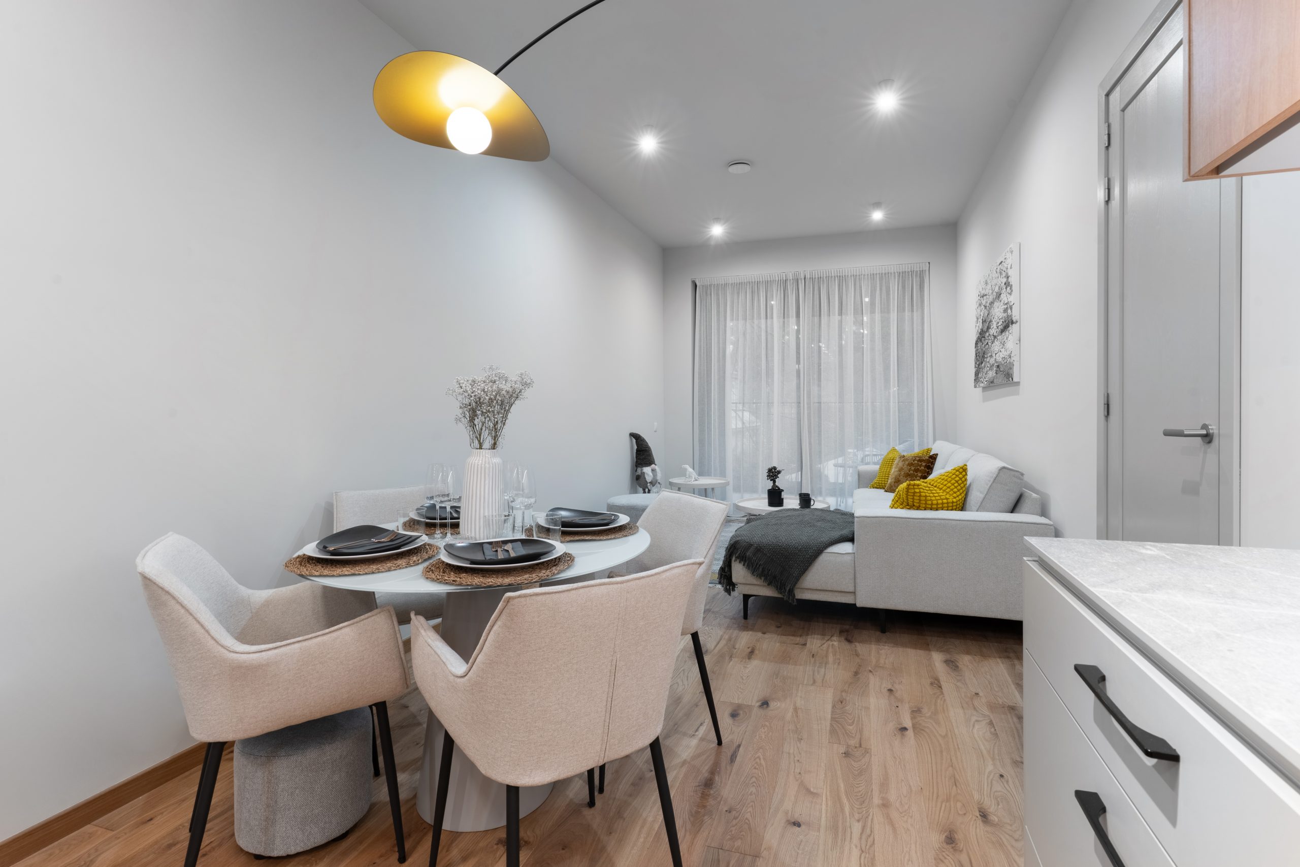 The interior of the Harmony Sky Garden demo apartment is inspired by the refined traditions of Nordic design — characterized by simplicity, elegance, and a deep respect for the proximity to nature. The selected high-quality, durable materials and carefully coordinated neutral color palette allow the surrounding landscape — the sea, sky, and pine trees — to become part of the space.