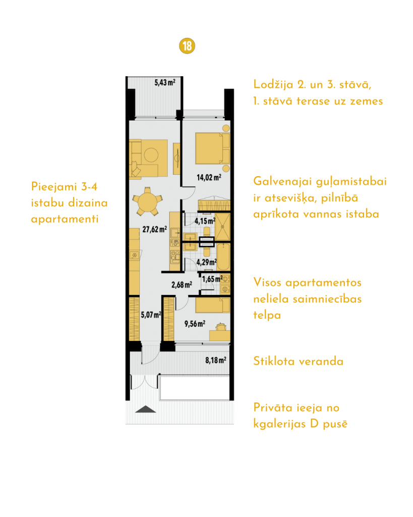 Trešā stāva sāna apartamentiem plašas jumta terases ar piekļuvi gan no iekštelpām, gan galerijas.