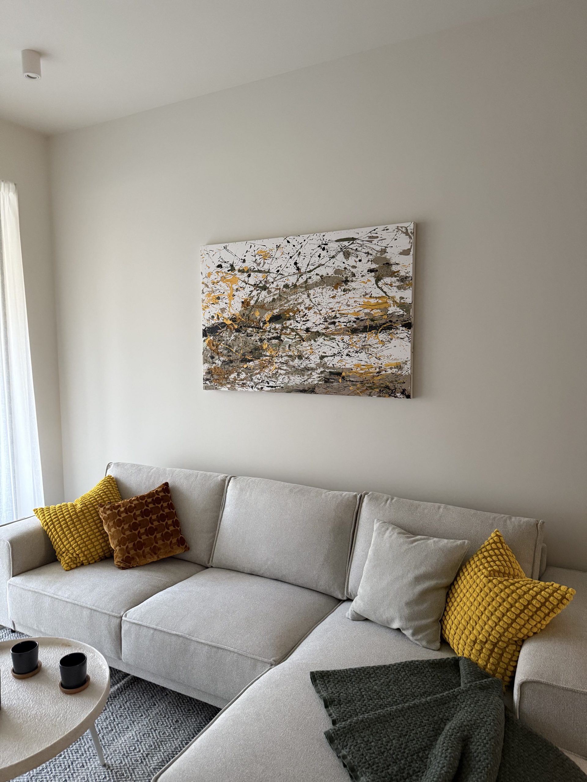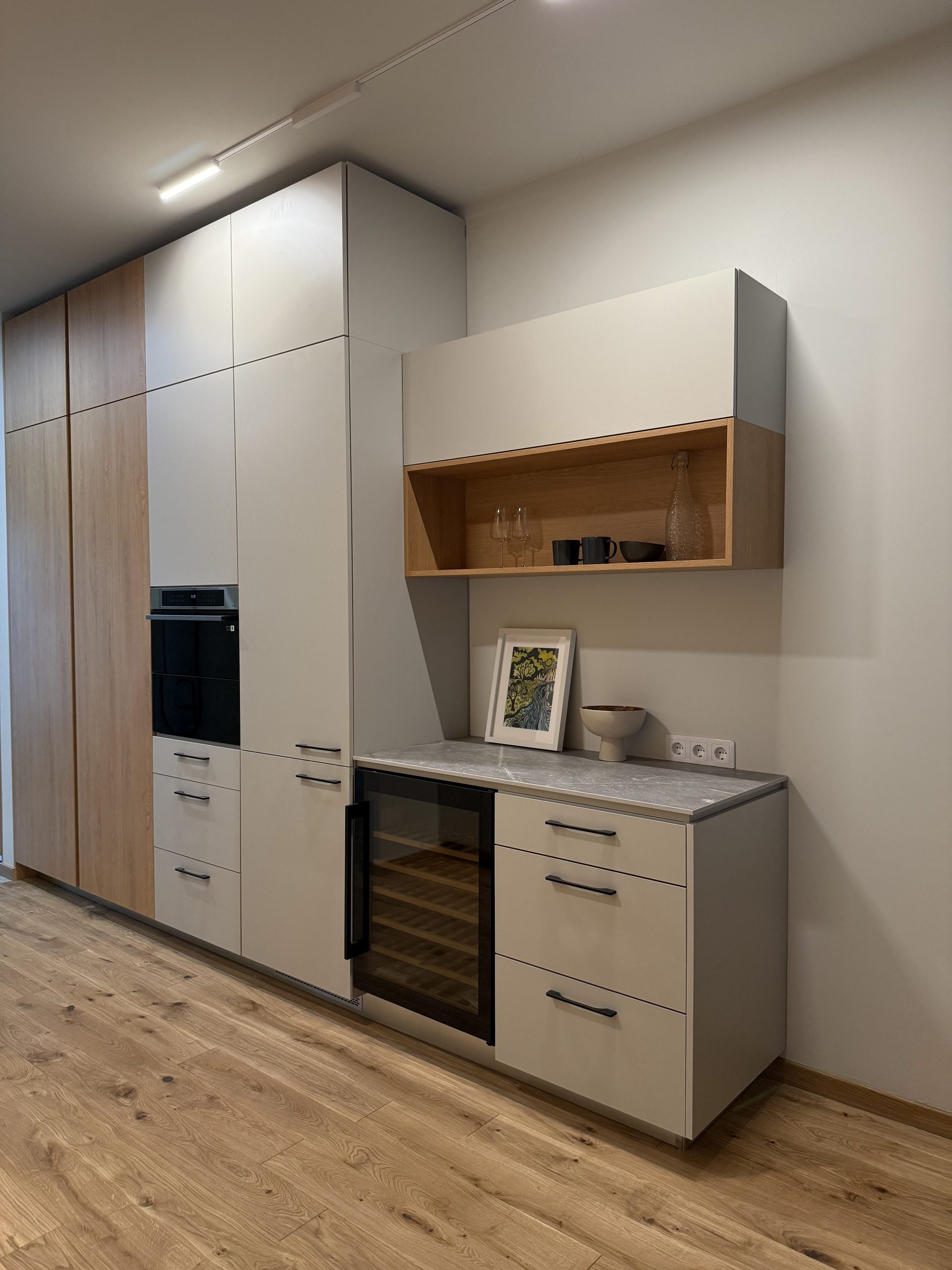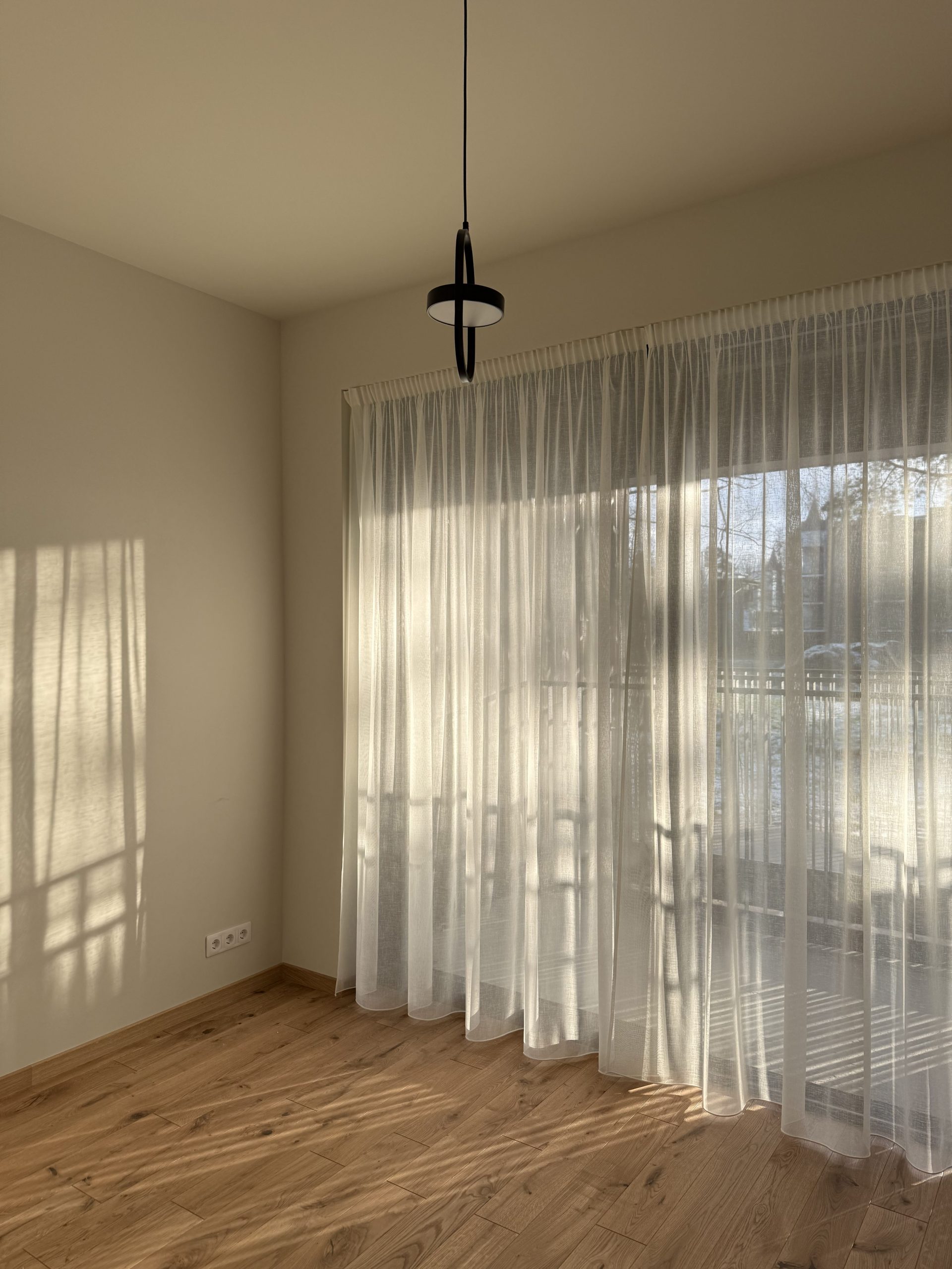 Sienas un griestu īpaši gaišā, siltā bēšīgā nokrāsa piešķir telpai mājīgumu, gaismu un elegantu minimālismu, vienlaikus saglabājot neitrālu fonu, kas ļauj viegli kombinēt ar dažādiem materiāliem, faktūrām un akcentu krāsām.
