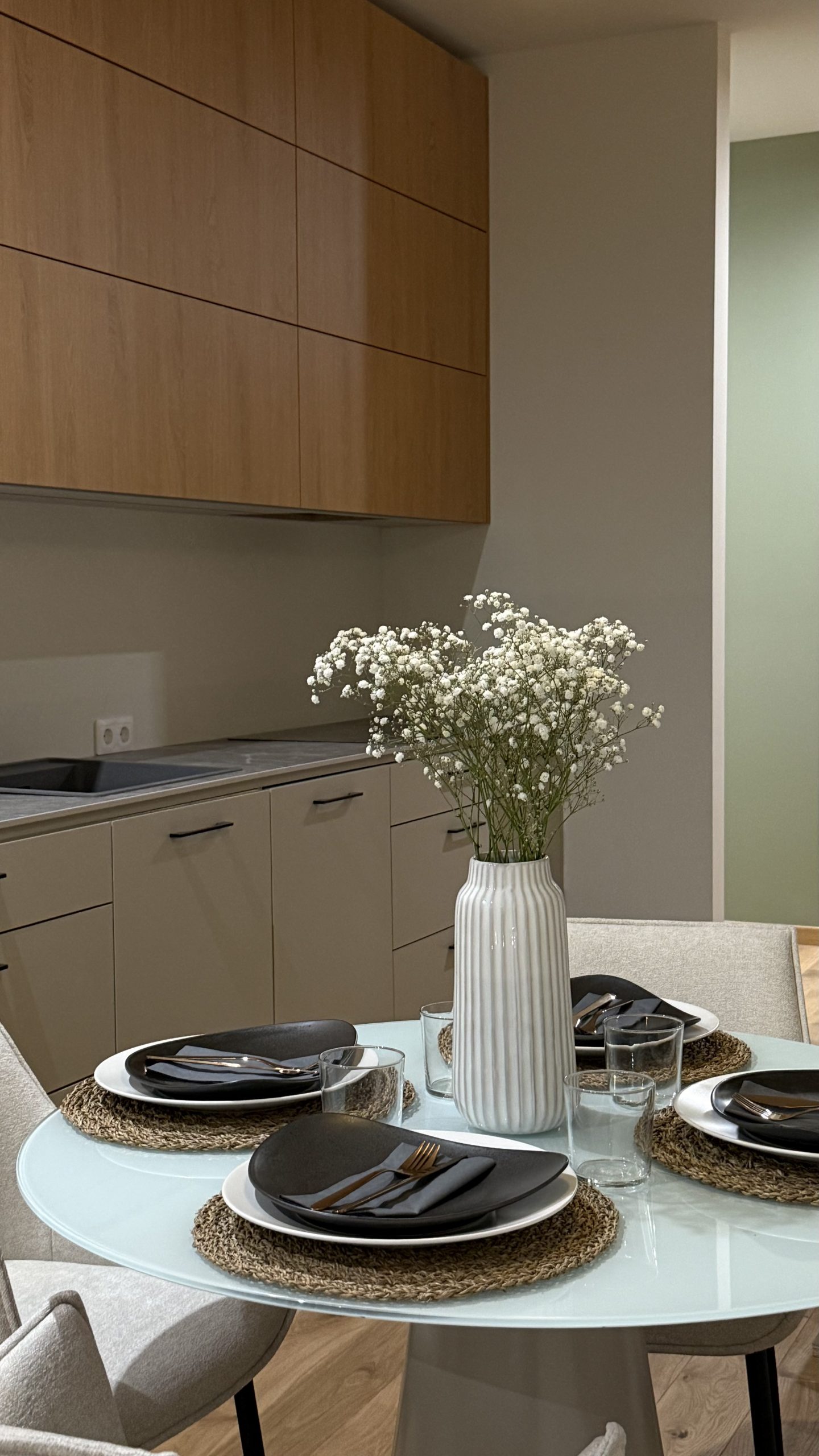 Harmony Sky Garden demo apartment interjers tapis, iedvesmojoties no izsmalcinātajām Ziemeļvalstu dizaina tradīcijām. Tajā dominē vienkāršība, elegance un cieņa pret dabas tuvumu. Izvēlētie augstākās kvalitātes, ilgmūžīgie materiāli un rūpīgi saskaņotā neitrālo toņu palete ļauj apkārtējai ainavai – jūrai, debesīm un priedēm – kļūt par daļu no telpas.